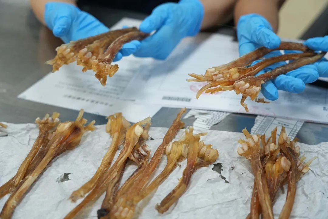 近日,广州海关在广州白云机场口岸快件渠道查获一批违规寄递进境的动物产品,现场查获干鹿筋26条、重440克。
