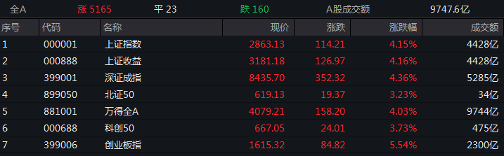 9月24日,市场全天放量大涨,三大指数均涨超4%,沪指创2020年7月6日以来最大单日涨幅。截至收盘,沪指涨4.15%,深成指涨4.36%,创业板指张5.54%。