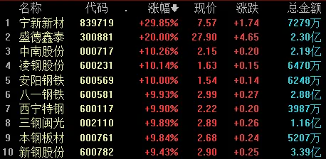 钢铁板块走强,宁新新材、盛德鑫泰、中南股份等涨停。