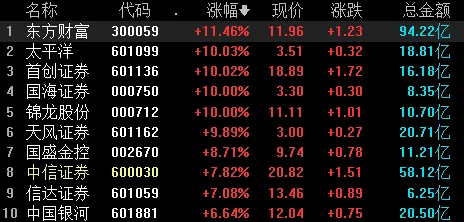 证券板块大涨,太平洋、首创证券、国海证券等涨停。