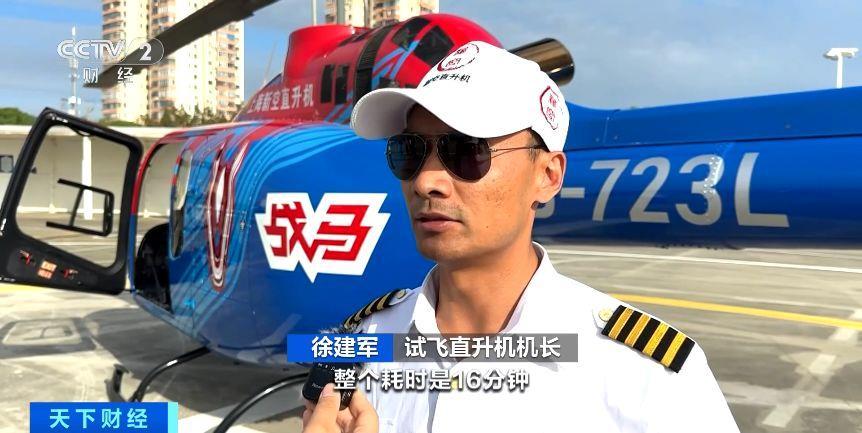 试飞直升机机长徐建军:7时32分从上海浦东的星野直升机飞行基地起飞,7时48分在上海金山水上机场落地,整个耗时16分钟。我们在8时从金山水上机场起飞,在8时20分之前在海宁落地。