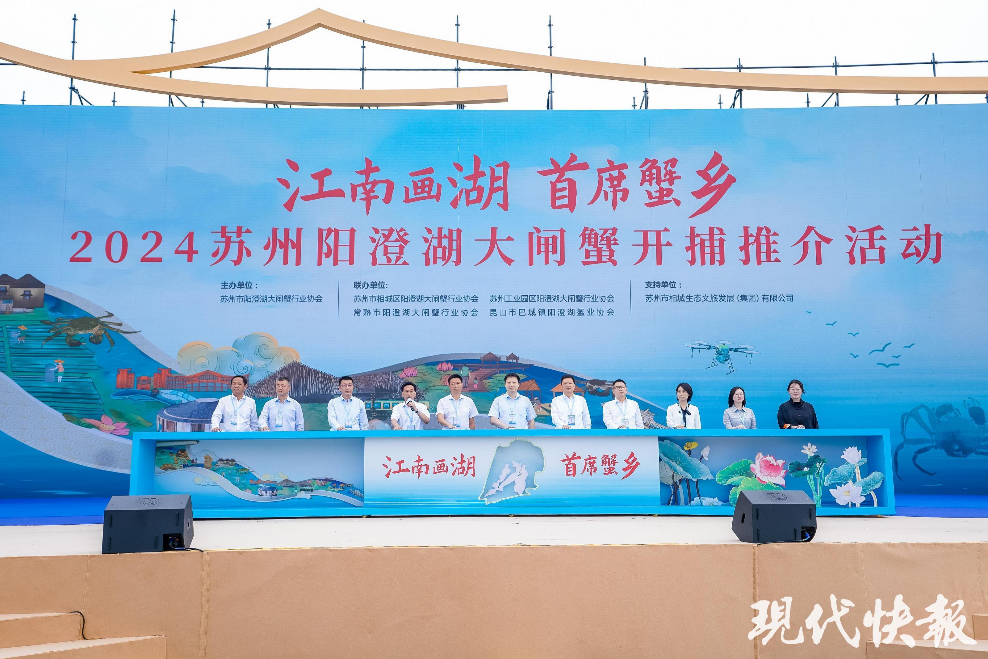 9月25日上午,“江南画湖首席蟹乡”—2024苏州阳澄湖大闸蟹开捕推介活动在苏州市相城区阳澄湖镇旅游集散中心开幕。10点18分,蟹农乐呵呵地拉起第一篓阳澄湖大闸蟹:“今年的蟹体型丰硕,长得很好,膏腴丰满!”