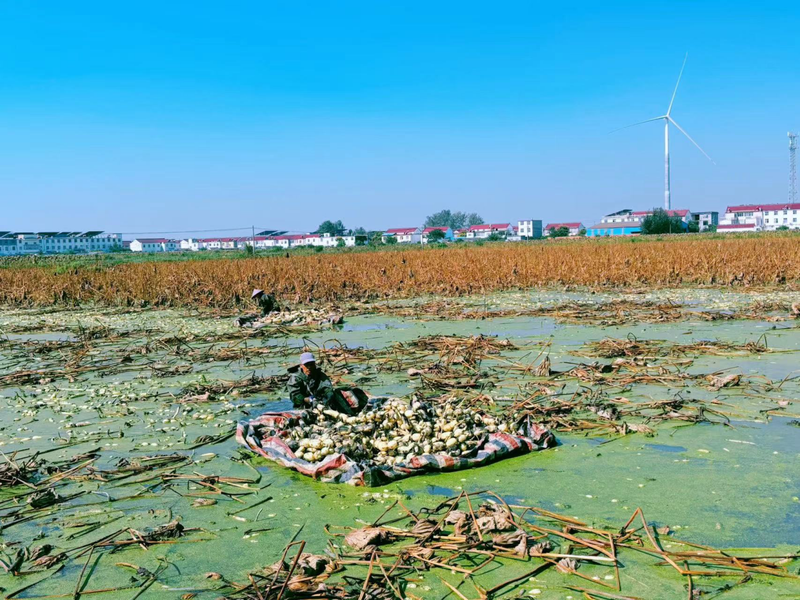 颍上县夏桥镇毛桥村的万亩莲藕特色种养基地,正式迎来丰收季。新京报记者揭明玥 摄