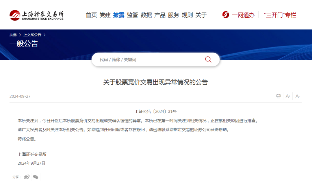 9月27日,上交所发布关于股票竞价交易出现异常情况的公告: