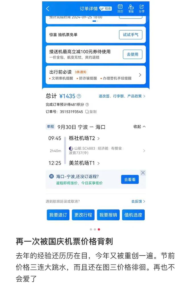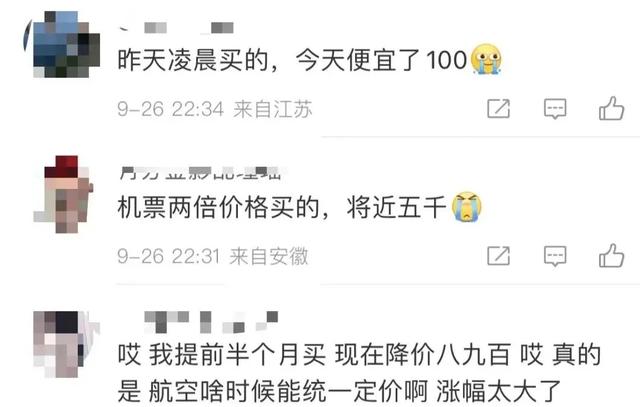 另外,有网友表示,自己买了9月30日宁波到海口的机票,加上燃油总计1435元,结果现在机票单价跌到700元,几乎差了一半,感叹买得太早。