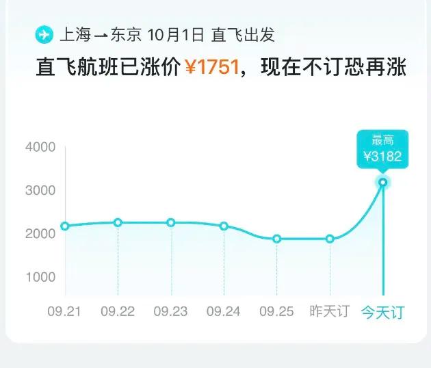 如10月1日上海直飞东京,最低直飞裸票价为3182元,耗时2小时50分钟。价格走势显示,已经涨价1751元。