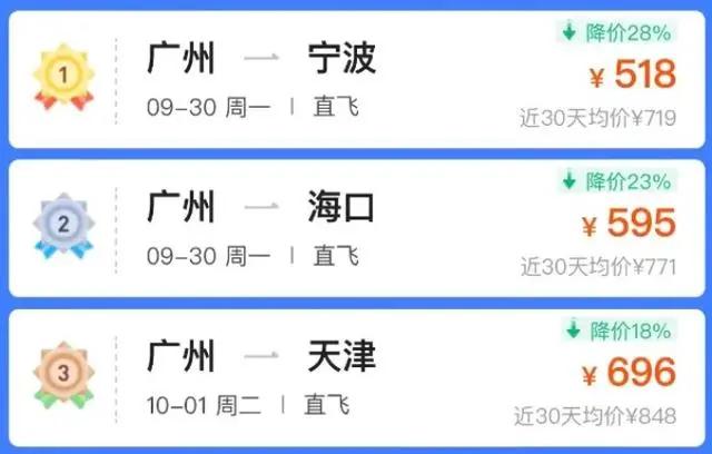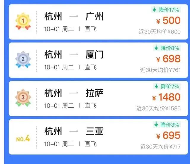 不仅如此,记者查询发现,不少热门城市国庆假期去程机票,都有不同程度的跳水。