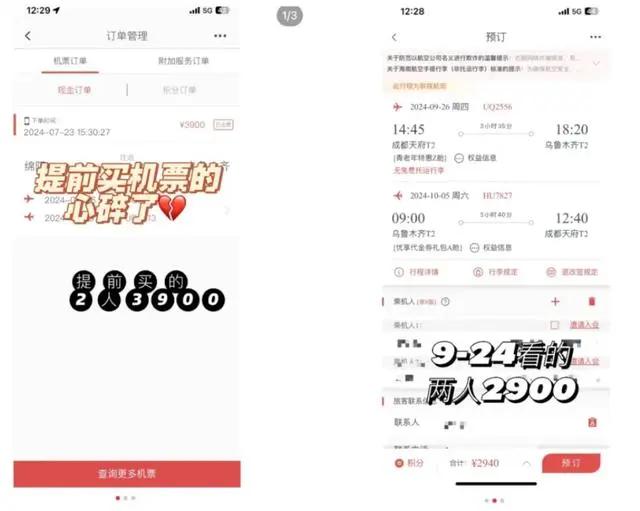 莫女士长居成都,国庆节计划前往新疆旅游,早在7月23日她就预订了往返机票,由于成都直飞新疆票价太贵,她特意选了附近绵阳机场飞新疆乌鲁木齐的航班,双人往返共计3900元。