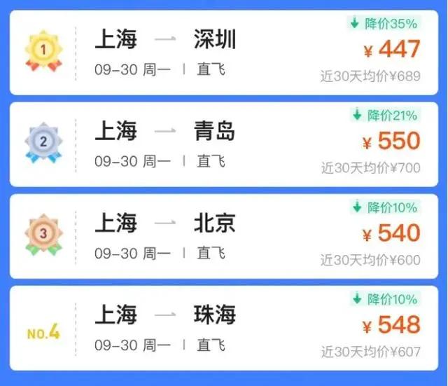 9月30日从上海出发到深圳、青岛等城市均有不同程度的价格跳水。