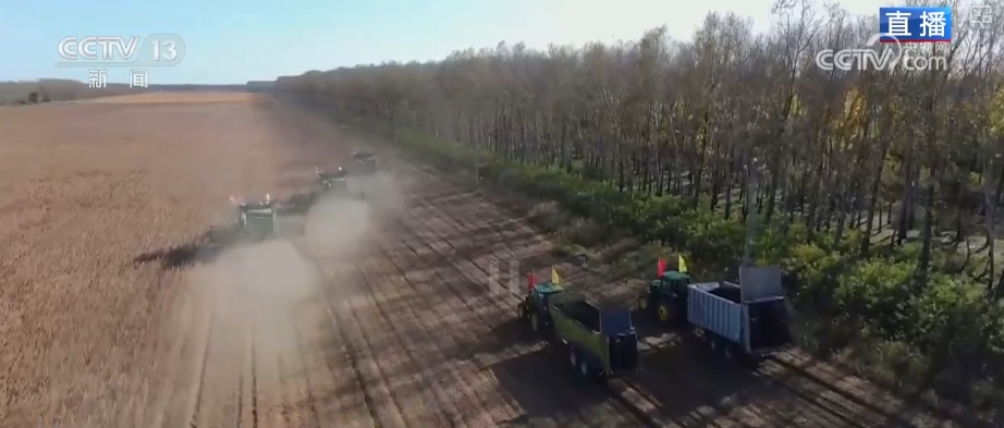 大豆种得好、长得好,怎么才能收得好?就是靠这种先进的大型收割机。种植户介绍,像这样的收割机,每台每天可以收获大约1500亩耕地,是普通收割机的三倍以上,大幅提升了作业效率。