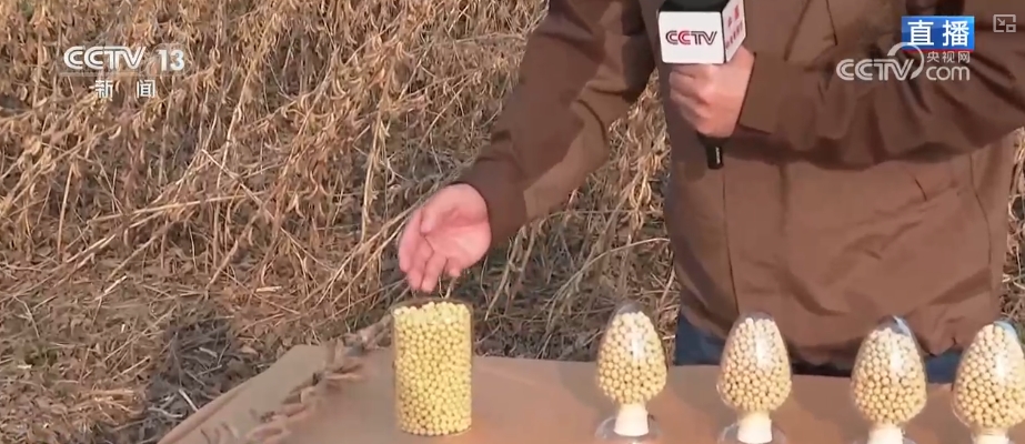 刚收获回来的大豆颗粒饱满、颜色金黄。种植户介绍,它的特点就是含油量高,适合用来榨油,而且这个品种还抗倒伏,产量也高。在收获之前,这个地块进行了测产,亩产可以达到250公斤以上,并且种植高油的品种,黑龙江省还有补贴,所以这里是既丰产还增收。机械收获高效减损秸秆还田提高肥力