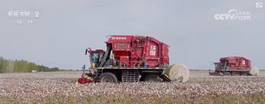 今年以来,新疆大力开展粮棉等主要农作物大面积单产提升行动,逐步建立与机采棉相适应的技术路线,机械化采收率一再提升,国产采棉机应用广泛。采收时可以一边采收一边打包,把棉花自动压缩成一个个两吨左右的大棉包,当地人也把它叫做“下蛋机”。