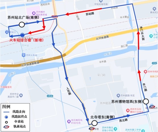 去程:火车站综合楼、苏州站北广场(南侧)、北寺塔东(南侧)、苏州博物馆西(东侧)