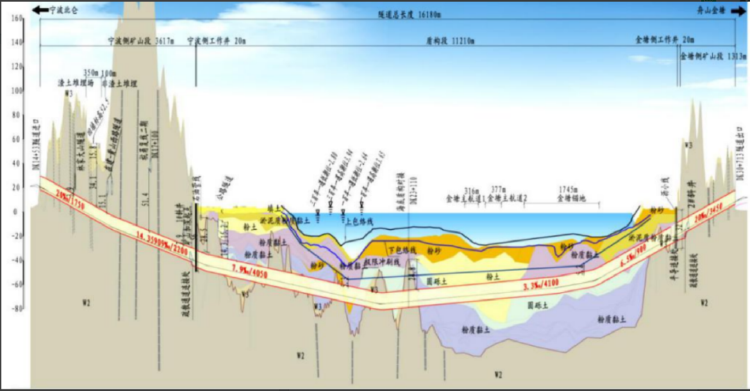 金塘海底隧道西起宁波市北仑区,东至舟山市金塘镇,全长16.18公里,其中盾构段长11.21公里,是目前世界上长度最长、地质条件最复杂、建设难度最大的海底高铁隧道,比港珠澳大桥的隧道还要长近10公里。