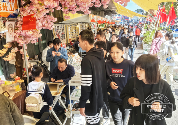 随着人流前行,特色商铺前的景象十分诱人,空气中混合着蛋糕的甜香。每个商铺前都排着长队,像五月Bowl鸡铺,不仅有小串在盆里散发着热气,还有外皮金黄酥脆的鸡腿,伴随着老板熟练操作,香味四溢。一位小朋友手里捧着一份小串念叨着真好吃。二次元主题店也很热闹,各种具有创意的文具、饰品等文创产品创意十足,店主热情招呼顾客,分享着各种动漫角色印章、这有山景点打卡印章和有仙品牌LOGO章等集章打卡活动。