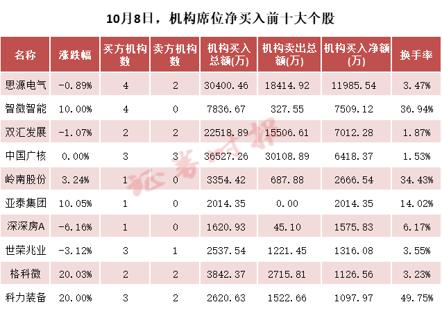 70只个股中,机构席位“净买入”的有20只,其中思源电气净买入金额位居首位,达1.2亿元,智微智能、双汇发展、中国广核等个股机构席位净买入金额超过5000万元。