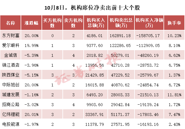 机构席位“净卖出”个股中,东方财富、爱尔眼科、金诚信、锦江酒店、陕西煤业、中际旭创、城建发展、招商公路、亿纬锂能、电投能源、粤高速A、新易盛等12只个股净卖出规模超过1亿元。
