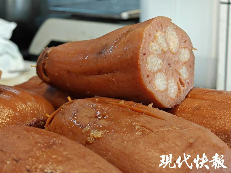 新鲜出炉的桂花马蹄糕,咬上一口软糯香甜,有一股淡淡的桂花清香。到了秋天,藕也进入一年中最粉糯的时节。糯米灌入莲藕孔中,连绵的藕丝牵住糖汁,一口下去,幸福感满满。