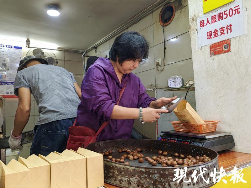 工作人员介绍,店铺还是只能用现金支付,每人限购50元,今年从河北收购板栗的价格低了,所以售价相应低了,从去年的26.8元一斤下调到22.8元一斤。记者看到,一锅炒了50分钟的栗子十分钟左右就卖完了。