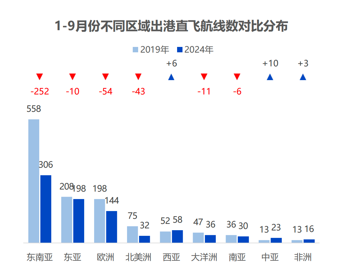 今年1至9月,民航国际出港客运航线数达843条(点到点直飞航线),涉及国外168个航点、71个国家,分别恢复至2019年的70.3%、84%、101.4%,其中通航国家数已超2019年。分区域来看,欧洲航线数量仅次于东南亚和东亚,和2019年相比减少了50多条。东南亚仍是航线数最密集的区域,不过相较于2019年减少两百余条,北美洲航线数不及2019年的一半,而西亚、中亚、非洲三区域航线数则已经超过2019年。
