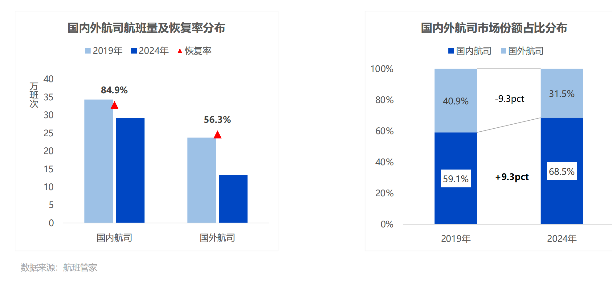 据第三方出行平台航班管家数据显示,从整体国际航线来看,2024年1至9月国内航司航班恢复率远高于国外航司,同时市场份额进一步提升。国内航司承运国际航班29.1万班次,恢复至2019年的84.9%,国外航司仅有56.3%;时刻份额占比上,国内航司由2019年的59.1%提升至68.5%,增长9.3个百分点,相应的国外航司份额下降9.3个百分点至31.5%。