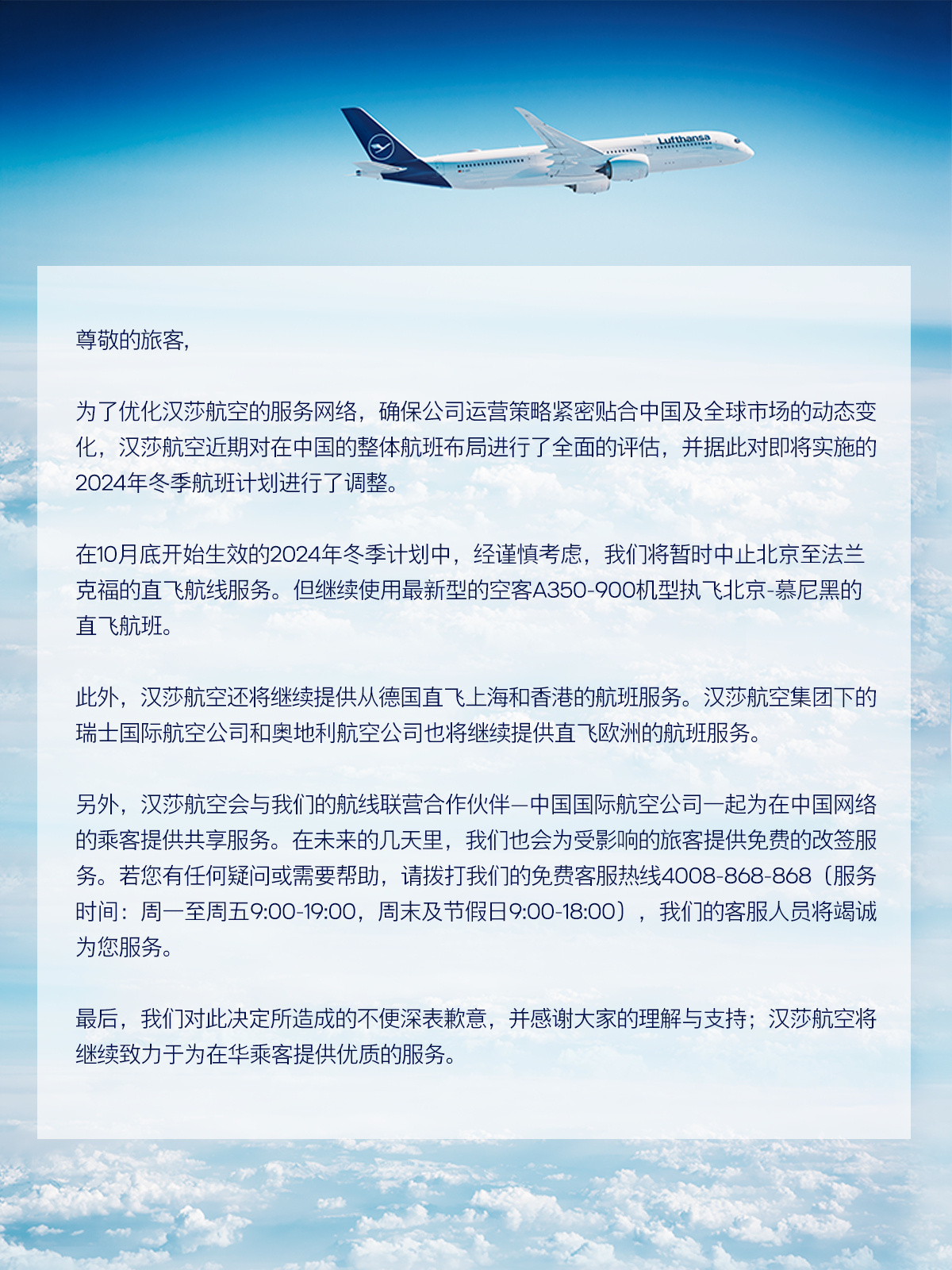 10月8日,@汉莎航空发布暂时中止北京至法兰克福直飞航班的通知。通知指出,为了优化汉莎航空的服务网络,确保公司运营策略紧密贴合中国及全球市场的动态变化,汉莎航空近期对在中国的整体航班布局进行了全面的评估,在10月底开始生效的2024年冬季计划中,汉莎航空将暂时中止北京至法兰克福的直飞航线服务。