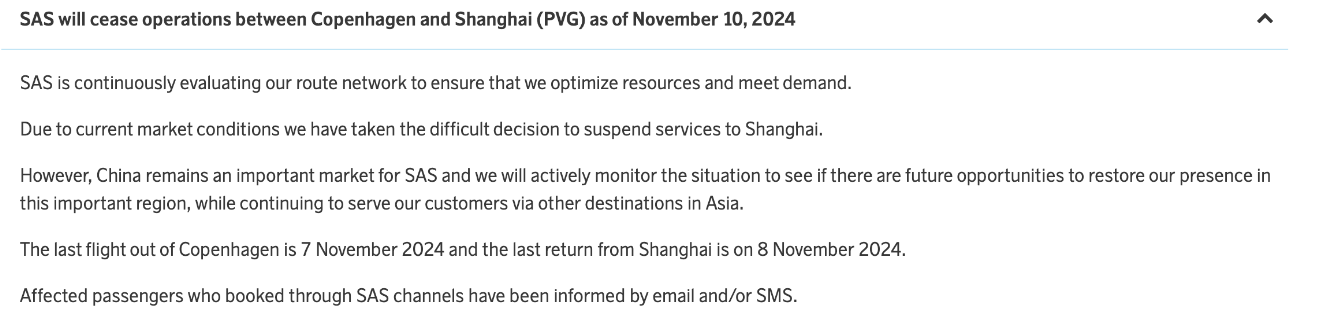 10月9日,澎湃新闻记者从某代理平台了解到,其收到北欧航空方面的通知称,北欧航空决定停止哥本哈根和上海之间的航班运营。2024年11月7日运营的航班,将是这条航线上的最后一个航班。通知中指出,现有的航线,导致旅行时间更长,成本更高。此外,北欧航空还面临着来自中国国内航空公司的激烈竞争。