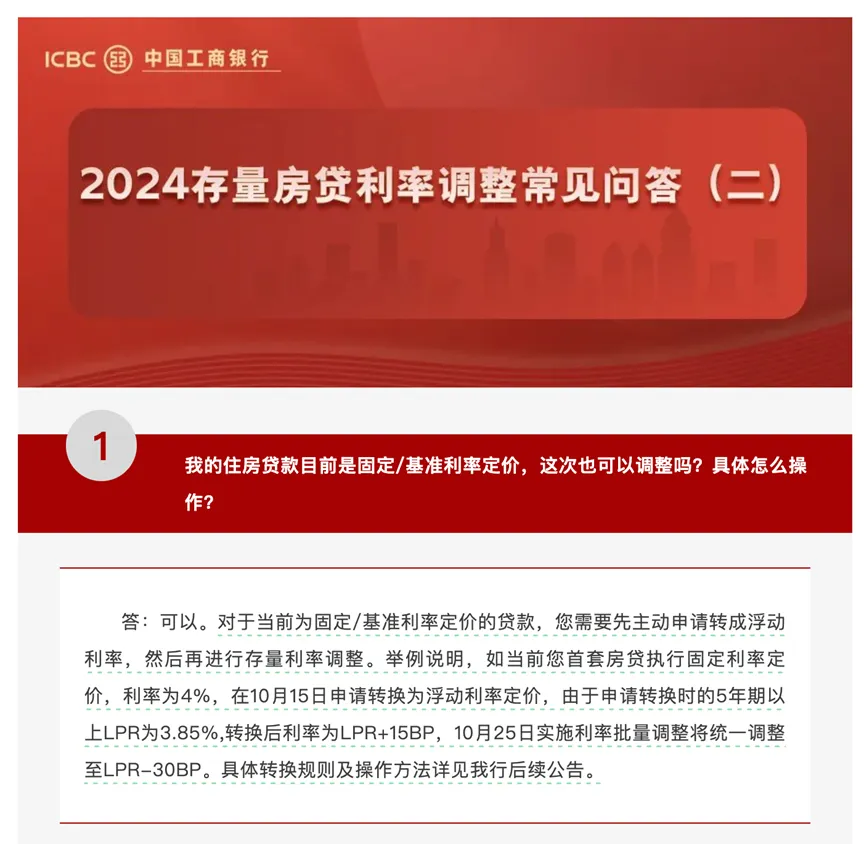 10月10日,工商银行发布《存量房利率调整常见问答(二)》。该行明确,10月25日实施存量房贷利率批量调整。