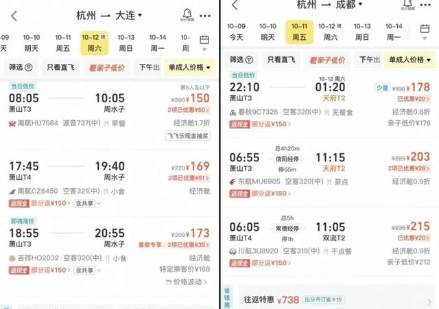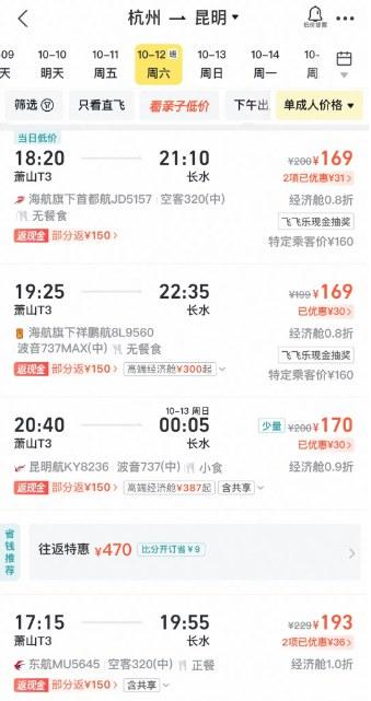 比如,10月12日杭州飞昆明