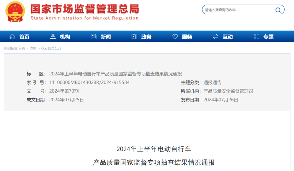 7月25日,国家市场监督管理总局通报了2024年上半年电动自行车产品质量国家监督专项抽查结果,共发现146批次电动自行车不合格。其中,爱玛电动车有5批次抽查不合格,为2022年至2023年生产,涉及不合格项目包括标识与警示语、充电状态主回路保护、互认协同充电、布线、反射器、照明和鸣号装置、充电器与蓄电池。