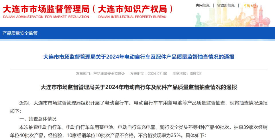 7月30日,大连市市场监督管理局发布大连市2024年电动自行车及配件产品质量监督抽查情况的通报,其中1批次爱玛电动自行车抽检不合格,为2023年3月生产,不合格项目为标识与警示语、互认协同充电。