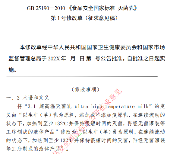 此次《食品安全国家标准灭菌乳》第1号修改单征求意见稿出台,被认为是为《灭菌乳》国标修订做准备。