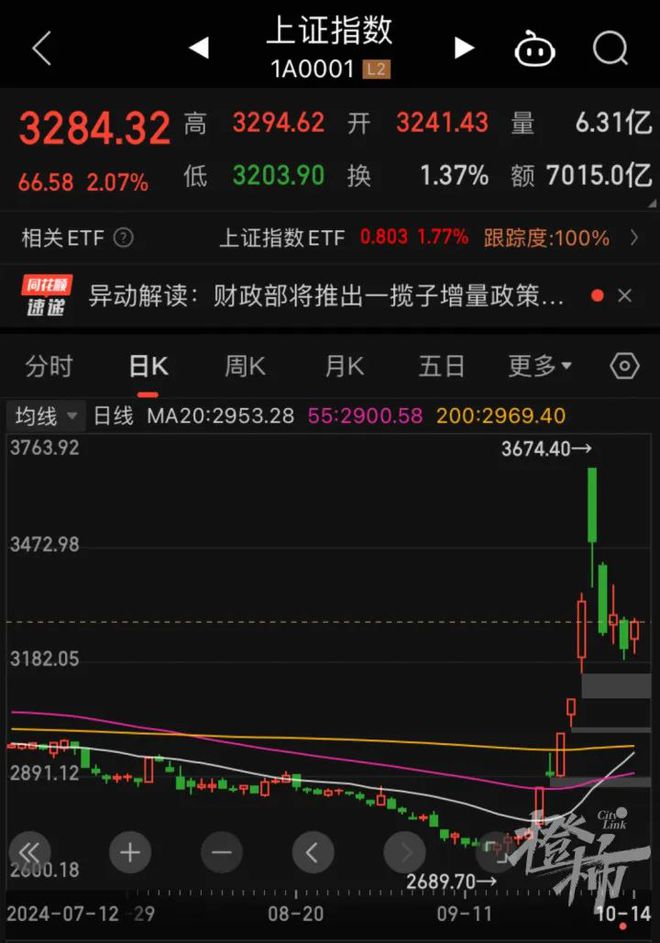 郑浩说,“我家里也有人炒股的,我爸2007年就在做了,但到现在貌似也没赚什么钱,这个好像是大多数老股民普遍的状态。没想到我这一新进来炒股的,这么快已经变成‘老股民’了。”他告诉记者,“国庆前后,股市氛围太好了,连我一个平常不怎么关心股市的都刷到了好多有关A股的视频,有教怎么开户的,有分析行情的,也有晒自己投资收益的,总结‘一个字’就是‘牛市来了’。”