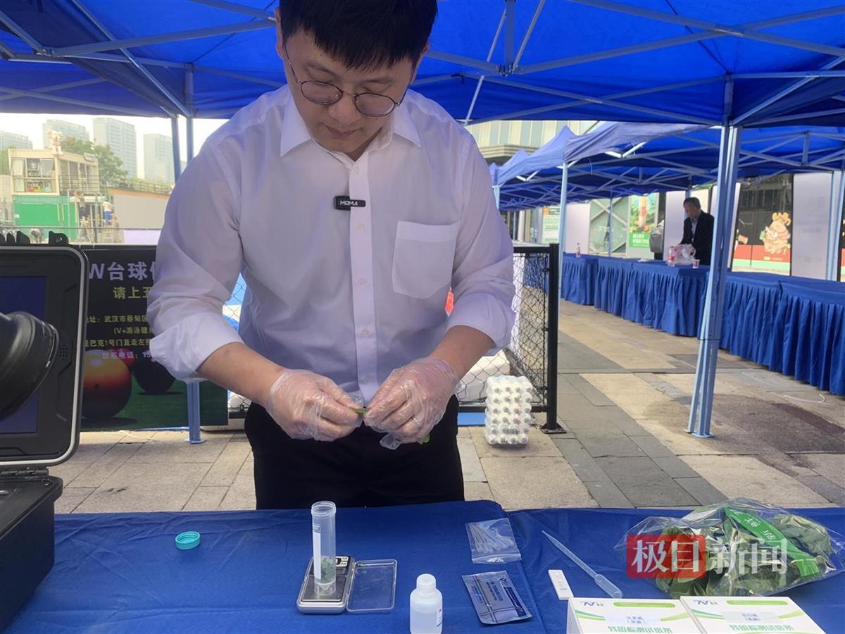 “我刚从超市买了把油麦菜,能在您这做检测吗?”“可以的,我们能做克百威农药残留的检测。”10月14日,在武汉经济开发区万达广场举办的武汉2024年食品安全宣传周活动上,极目新闻记者看到不少市民朋友,手拿需要检测的蔬菜、瓜果、肉类直奔食品快检车,体验快检服务。