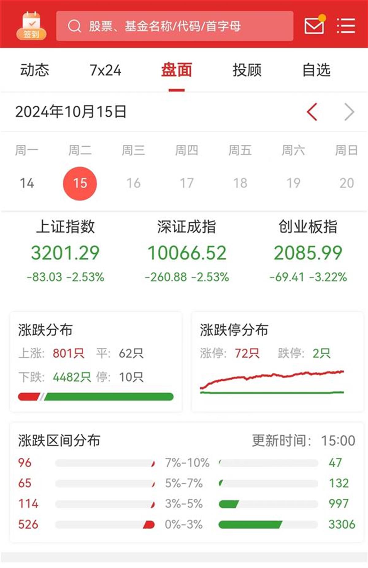10月15日,A股三大股指低开高走后又回落,全天震荡下挫,创业板指领跌。截至收盘,上证指数跌2.53%,报3201.29点,深成指跌2.53%,报10066.52点,创业板指跌3.22%,报2085.99点。沪深两市合计成交额16347.8亿元,连续第7个交易日突破1.5万亿元,市场4482只股下跌,801只股上涨。