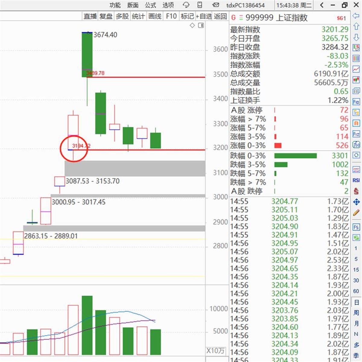 从周一的走势来看,上证开于3241点,最低回踩3203点,守住了前期低点3194点,华为及军工板块领涨。从周二的走势来看,上证低开低走,收盘收于3201点,再次勉强守住了3194点,周三将再次直接考验3194点,如果守不住,再有向下回补节前9月30日缺口的可能。倘若如此,向指数还要向下,这是操作层面必须要注意的问题。