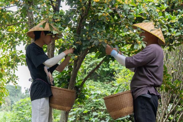 摘桂花也很有讲究,花要尽可能在含苞待放的状态时就及时摘下。“也就是桂花冒头的前两三天,这时候香气最浓郁。”花朵娇嫩,需要人工采,“要赶着早起去摘,中午的温度上去了,会影响品质。”