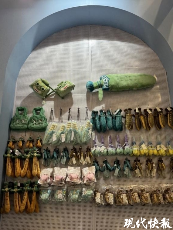 超市“美食区”主要陈列以食品为设计灵感的文创:备受期待的苏州博物馆毛绒螃蟹“蟹青青”首次亮相。还有近期在网络走红的苏博“蟹黄黄”系列、定胜糕毛绒挂件和毛绒粽子挂件以及甘肃省博物馆的“毛绒麻辣烫”系列也集中在这里。