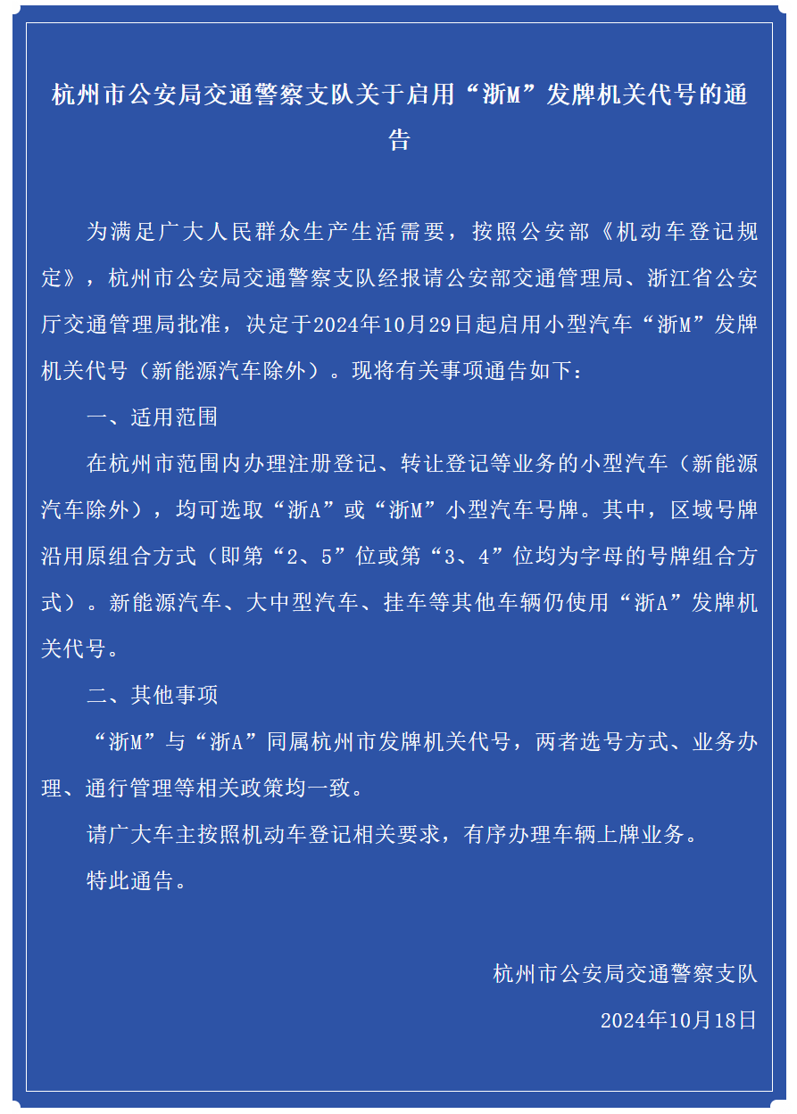 为满足广大人民群众生产生活需要,按照公安部《机动车登记规定》,杭州市公安局交通警察支队经报请公安部交通管理局、浙江省公安厅交通管理局批准,决定于2024年10月29日起启用小型汽车“浙M”发牌机关代号(新能源汽车除外)。现将有关事项通告如下:
