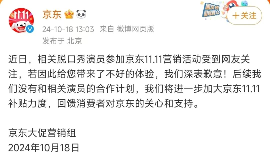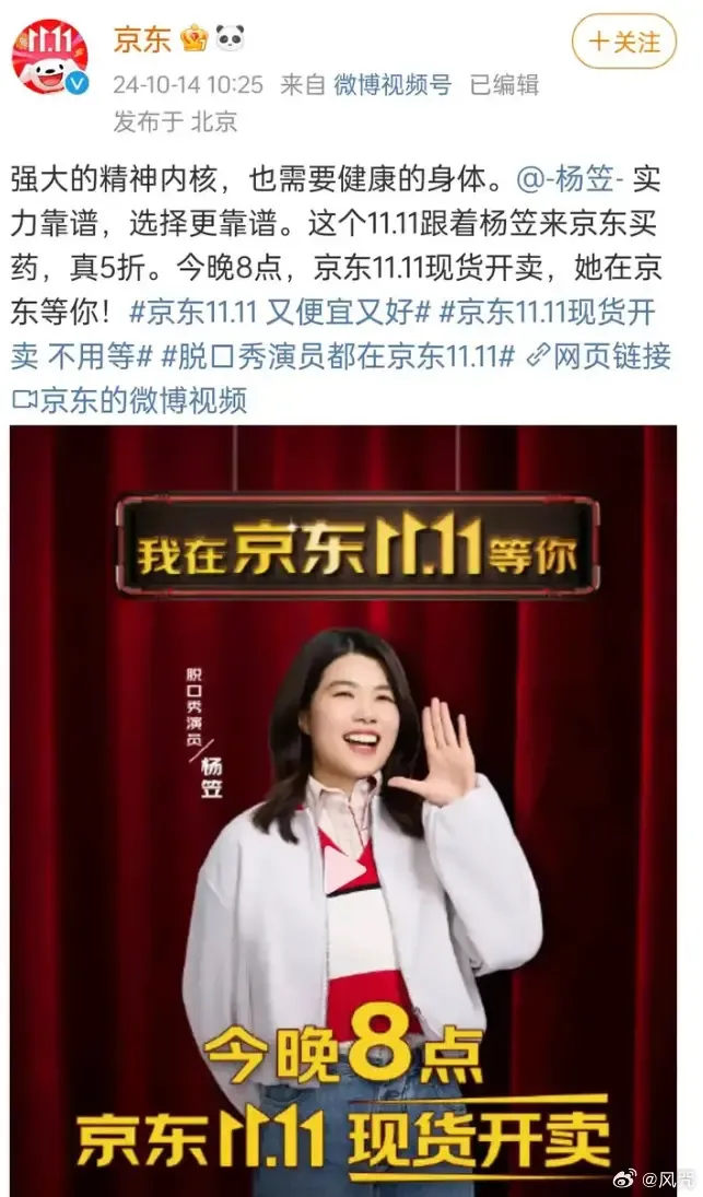 10月14日,京东在社交媒体上发布了以杨笠为主体的“双11”广告。