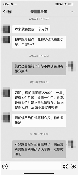今年6月,姜某找田女士,问她要不要续租。田女士觉得奇怪,因为才过了半年。后来姜某持续劝说,把租金从24000一年降到22000一年,田女士动心了。今年10月3日和姜某签约续租,又向姜某转了一年房租和押金。