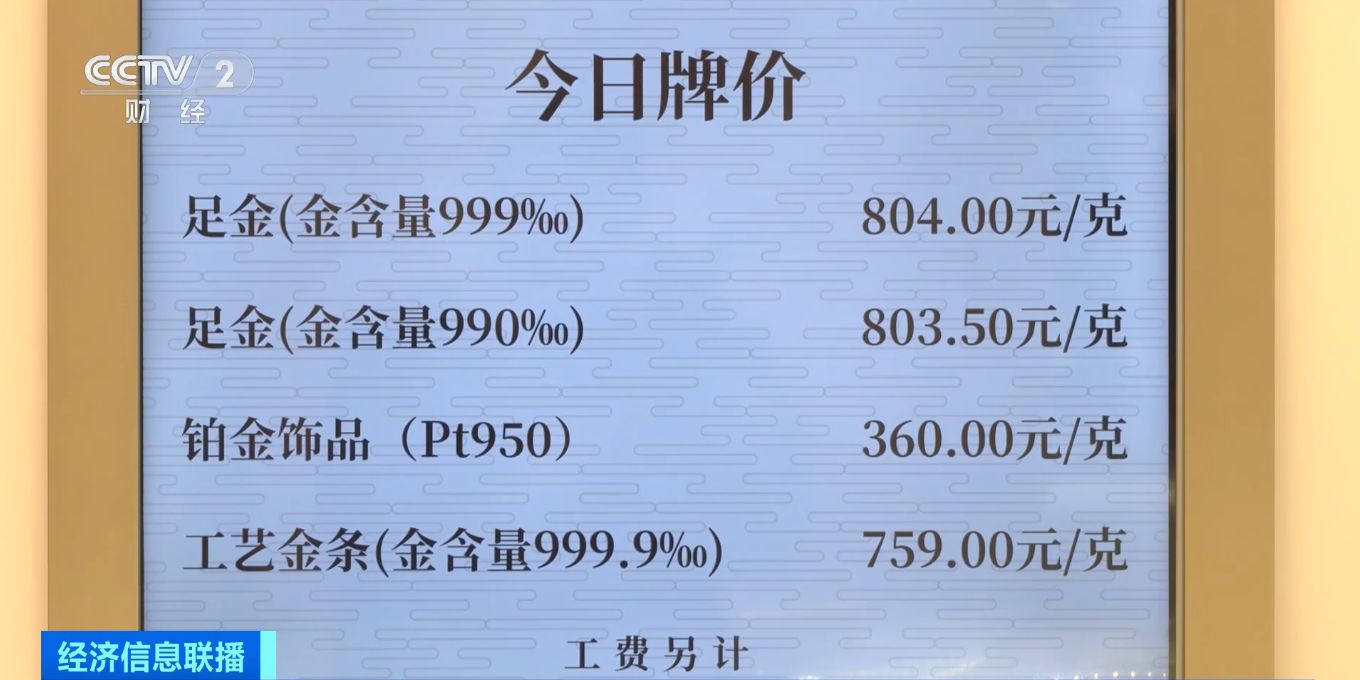 而在另一家黄金销售门店,店内价格表显示足金首饰零售价格为每克804元。店家表示,今年3月以来金价调价频次较高,有不少消费者持观望态度,不过也有一些刚需购买者。