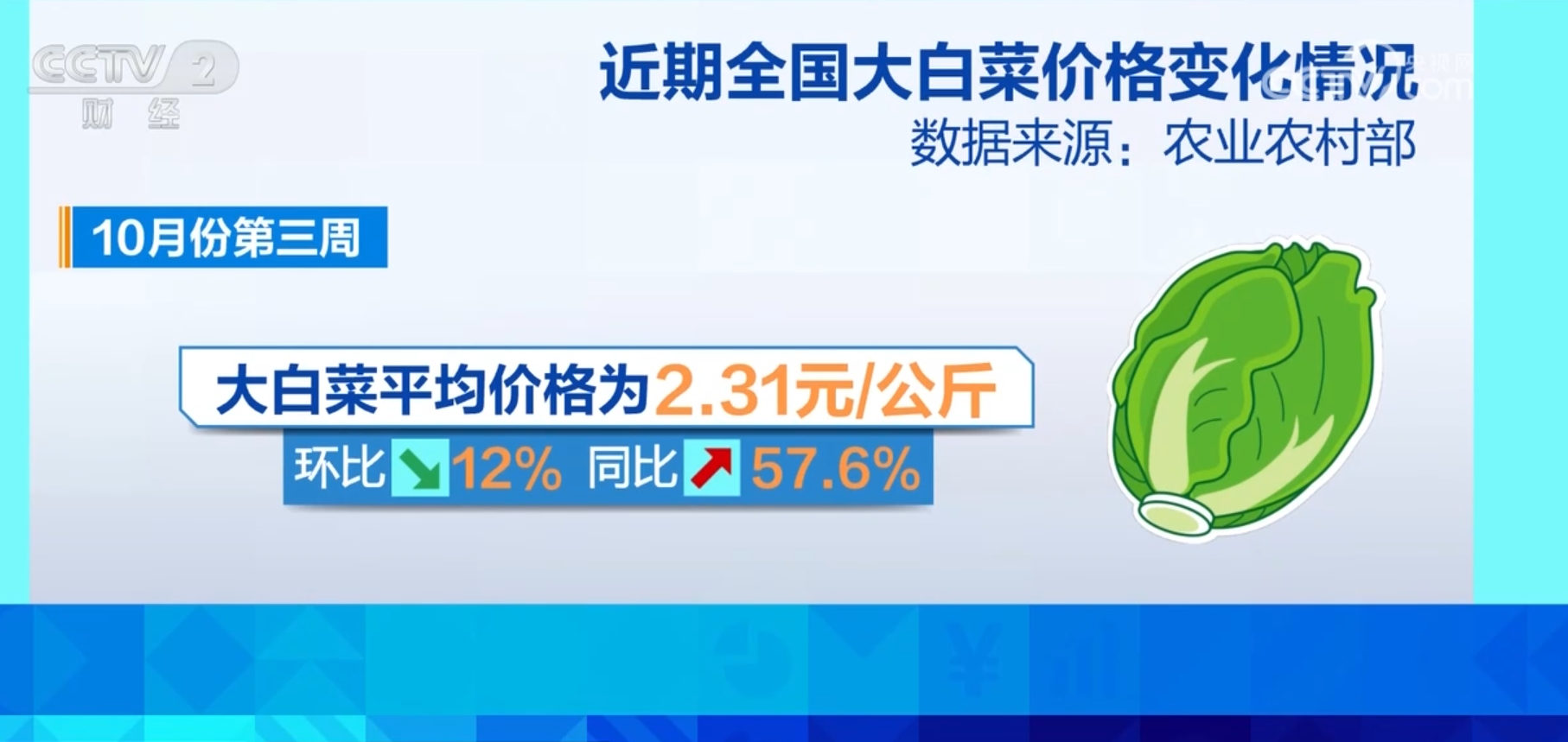 从全国来看,10月份第三周全国大白菜平均价格为每公斤2.31元,环比下降12%,同比上涨57.6%。