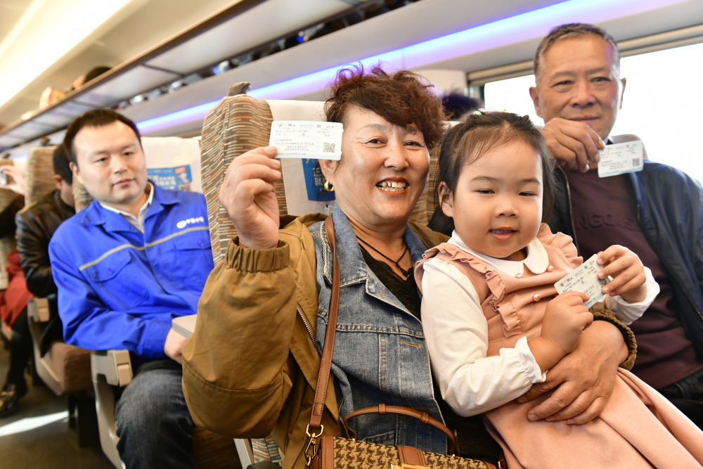 乘坐首发列车的乘客在展示自己的车票。新华社记者 郭绪雷 摄