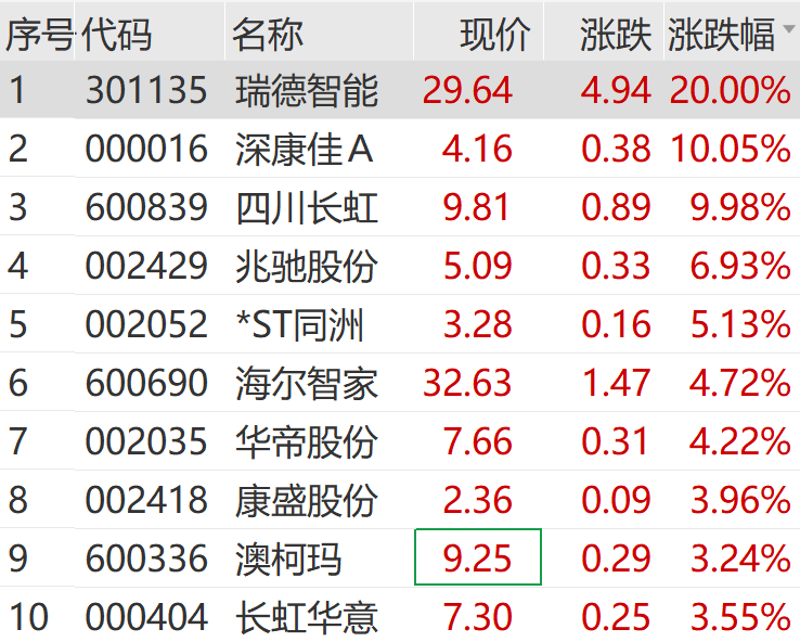 另外,上午家用电器、食品饮料等大消费板块均有不俗涨幅,带动市场整体上行。瑞德智能、深康佳A、四川长虹、岩石股份等多股涨停。