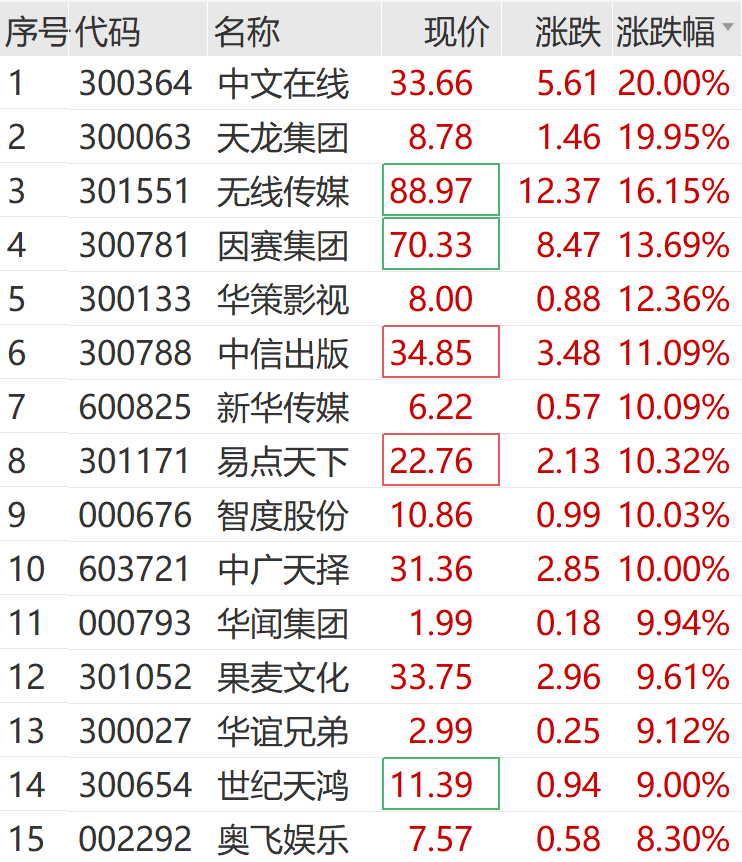 上午传媒板块快速拉升,短剧游戏、抖音平台、Kimi等概念接连走高。中文在线、天龙集团20CM涨停,智度股份、中广天择、华闻集团等多股涨停。