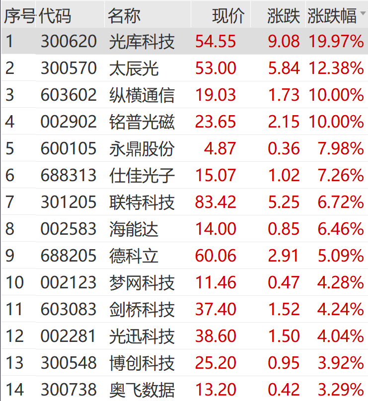 10月22日早间,CPO、光通信概念股集体走高,铭普光磁竞价阶段即涨停,光库科技盘初接近涨停,太辰光、永鼎股份等多股涨幅居前。