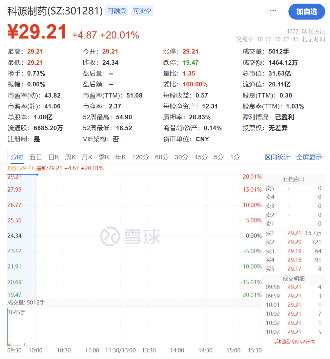 10月22日上午,科源制药在集合竞价阶段即走出20CM涨停。截至发稿,科源制药仍保持一字涨停状态,股价为29.21元/股,涨幅为20.01%。