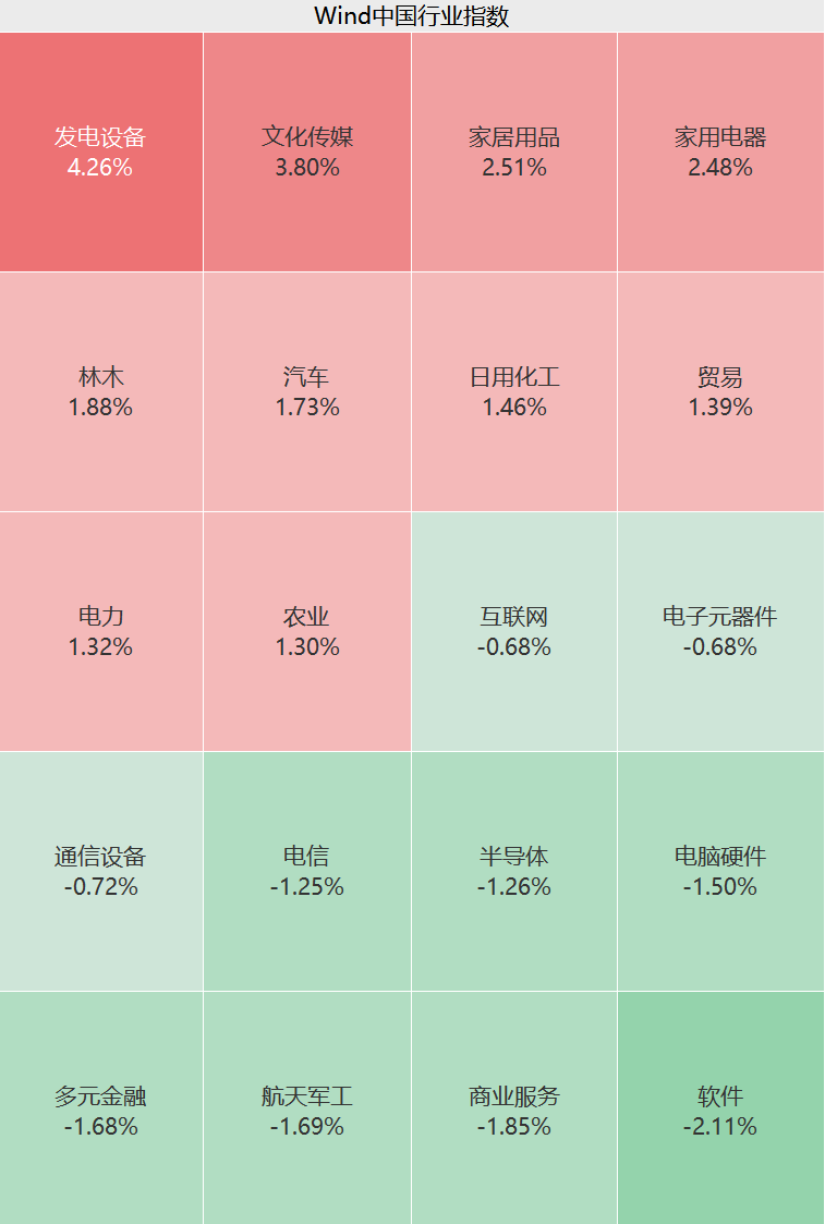盘面上,上午文化传媒、发电设备板块走高,家用电器、酒类等消费股造好;软件、航天军工、商业服务等板块有所回调。
