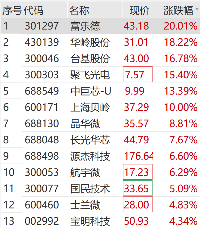 半导体板块局部走高,富乐德20CM涨停,上海贝岭涨停,华岭股份、台基股份、聚飞光电等涨幅居前。